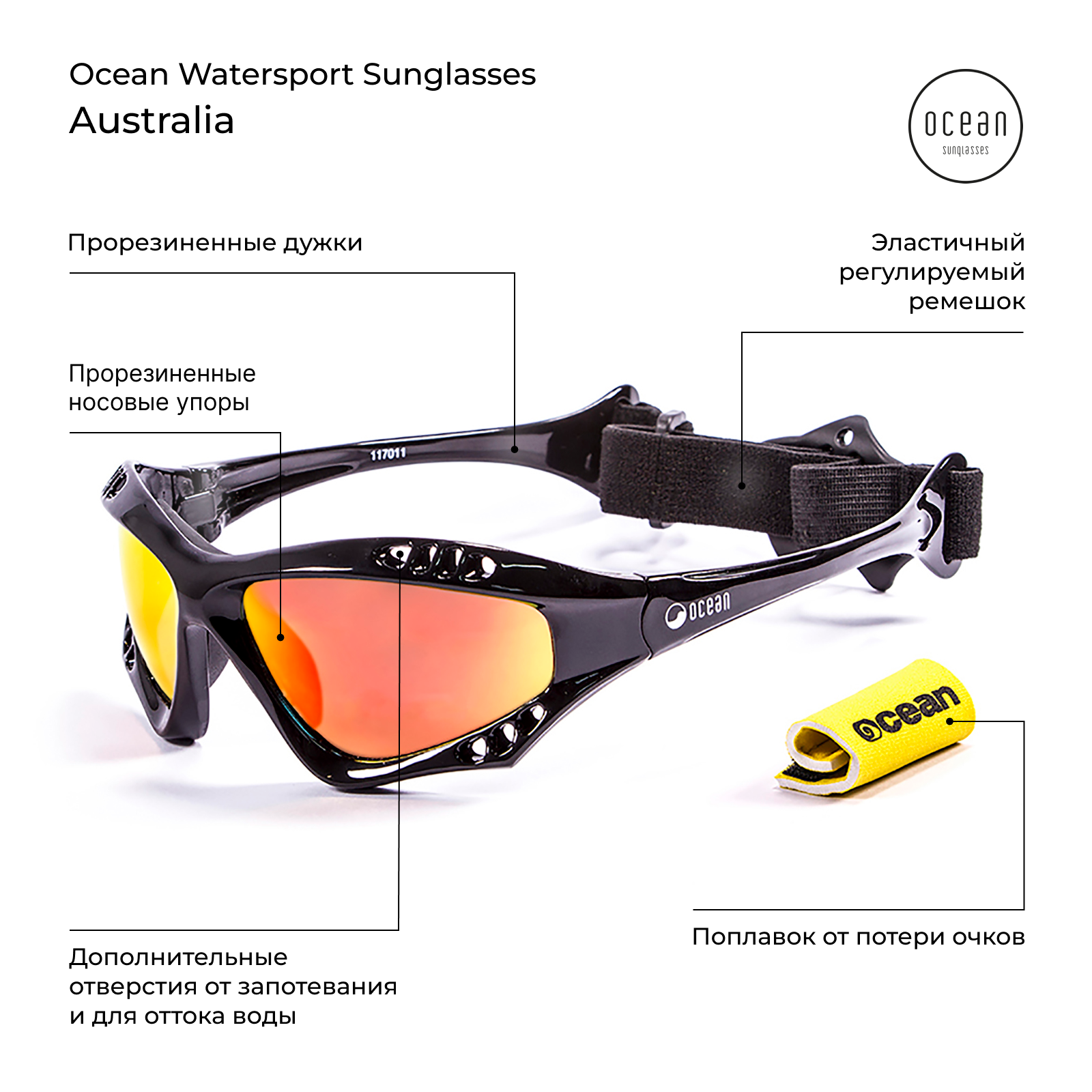 Очки, тканевый чехол, эластичный ремешок, поплавок от потери.